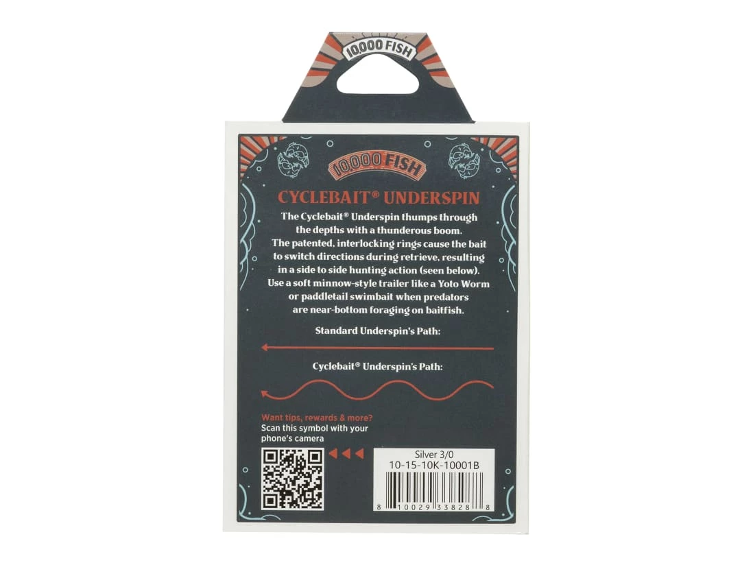 The Cyclebait Underspin thumps through the depths with a thunderous boom. Forged with a patented ring system and blade connection that causes the bait to switch directions during retrieve, resulting in side-to-side hunting action. Rig the Cyclebait Underspin with a soft minnow-style trailer or paddletail swimbait when predators are near-bottom and foraging on baitfish. Use a steady retrieve to achieve the side-to-side scamper. Try to stay just off the bottom or through the middle of the water column.